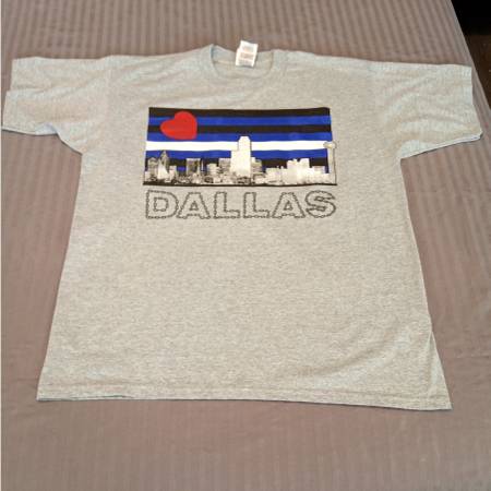 Design features the Leather Pride Flag with the Dallas Downtown Skyline superimposed along the bottom of the flag. Below the images is the word "DALLAS" in a font that uses a chain to create the edges of each letter.