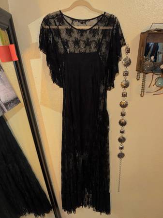 • I only wore it once for a gig, but I’m trying to make space so I need to get rid of it ASAP It’s a Medium but stretches, Has a short dress underneath. I’m 5’2 and it goes down to my ankles (Hablo español ☺️)