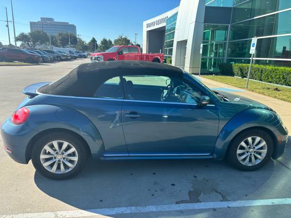 2018 VW Beetle Convertible in dark blue with a black soft top. It has black leather interior seating with no rips, tears, or scuffs, and blue accent detailing to match the blue exterior. A little less than 70k miles on it. It’s in great shape, no dents, no electrical or engine issues whatsoever. It’s has Bluetooth compatibility and a perfectly functioning backup camera. Last oil change was in November and has 4 new tires (as of May). It is a turbo as well. It hasn’t been in any major accidents and though carfax will tell you it’s had a moderate accident, that “moderate” was from hitting a raccoon many years ago. It looks like new and runs like new.