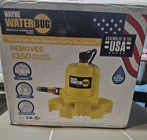 Water bugging you, The Wayne WWB WaterBUG Submersible Water Removal Pump with Multi-Flow Technology is the tool for you. Our Patented Multi-Flo Technology is key and allows the user, easy selection of the appropriate discharge for the water removal application. The top discharge should be used to drain water from confined spaces; a window well, even from 5 Gal. buckets. Side discharge should be selected for easy water removal from open areas; flat roofs, flooded basements, flooded yard. Our Patent Pending multi-ring suction strainer filters debris, keeping it clear from the suction intake which minimizes clogging. This powerful tool pumps up to 1257 Gal. Per Hour, connects to a standard garden hose and removes water down to a 1/16 in. of the surface, making the area Virtually dry. For Quality you can trust. Stop allowing water to bug you. Remove it with WaterBUG.Eliminate standing water in your yard, and the risk to attract mosquitoes, use the water bug to stop the bugs