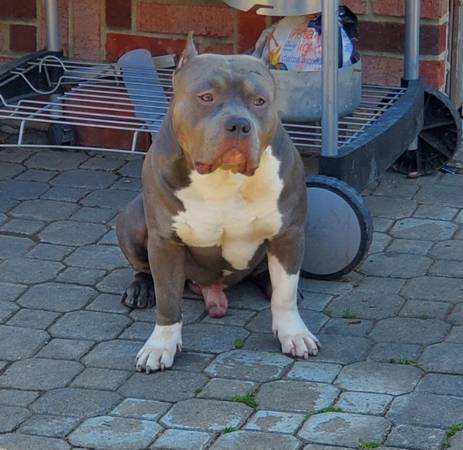 8 months. ABKC registered. Great with children and other dogs. Crate trained. Last 3 pictures are the parents. 1500 obo