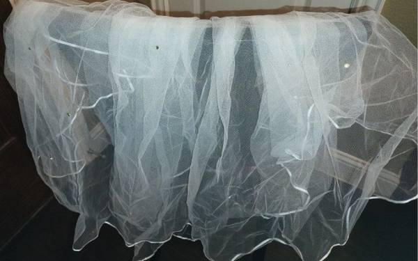 *$15-Ivory Bridal Veil (clear and removable very light sage Rhinestones) 2T 2 Tier 1/8" Ribbon Edge Center Gathered Rhinestone Crystal Bridal Veil1Length: 1st tier 30", 2nd tier 36". Standard fullness 72 inches in width. Edge and decorations: 1/8 Inch Ribbon Edge and Scattered Rhinestone. Gently Used- wore less than an hour, Excellent condition - Smoke free and no cats or dogs environment.