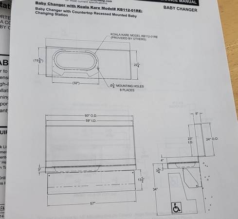 Once it is set up, the piece measures at 60"W x 22.25"D x 32.75"H. This includes a white recessed cabinet, a mounting bracket, and a bottom support. This also includes a Koala Kare recessed baby changing station you can place inside the cabinet piece. The station measures at 32"W x 19.63"D. It also has a belt to safely place the baby. This piece alone retails for over $300! The whole piece has been inside the box so all the parts are still wrapped up. You can come and see this at Recycled Furniture here in Irving. We mostly sell office and school furniture if that is something you're also looking for. Feel free to contact us for more info. You can also just click on the "more ads by this user" link for more of our inventory.