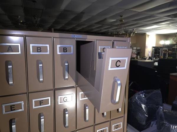 We have an S103 document file cabinet available for $250. This cabinet is made by Steel Fixture. The cabinet measures at 30.38"W x 14"D x 71"H. It is made of "Sage" or brown colored steel. The cabinet has a total of 36 vertical style drawers. These can be easily pulled out for a faster and simpler filing. The whole piece is in really good condition with very minor cosmetic wear to it. This is so you can file thinks like folders and document or anything that fits inside the drawer. Each drawer also has a label holder. This cabinet can be seen here at Recycled Furniture in Irving. We have several other types of storage cabinets to look at. Feel free to contact us for more info. You can also just click on the "more ads by this user" link for more of our inventory.