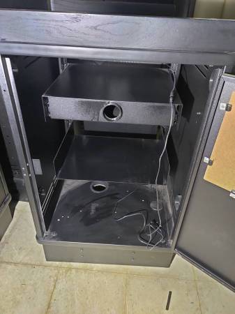 They are constructed of black colored steel with the top of the lectern and the fold out side trays made of wood. They also have some slots to run some cables through. Inside, they have three shelves (one slides out) to setup your electronics whether be media based or a PC. The backs of them are all open for easier access for wire management and storage.