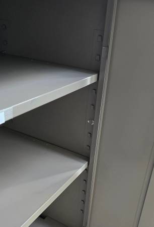 The cabinets measures at 36"W x 18"D x 42"H. The cabinets are made of gray colored steel. They have two doors with two adjustable shelves inside. The cabinets also have a lock and key. The cabinets is in pretty good condition with just some minor cosmetic wear. The cabinets can be used to store your paints, spray cans, tools, or whatever else you need to store and lock up. Recycled Furniture here in Irving has this and some other storage cabinets. Feel free to contact us for more info. You can also just click on the "more ads by this seller" link for more of our inventory.
