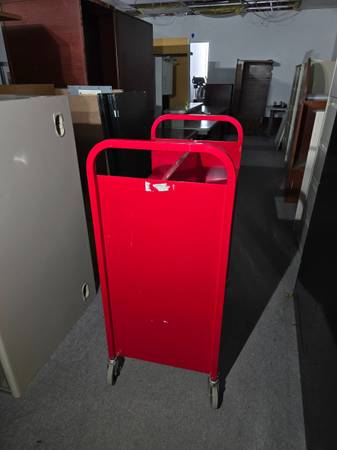 We have a book truck available for $150. This is typically used to help store and sort books. It is made of fed colored steel. It is double sided with a total of six angled shelves. The cart measures at 31"W x 20"D x44.5"H. The cart has two handles to move around easier. It does have some minor scratches but overall, the wear is just purely cosmetic. Recycled Furniture here in Irving has this and a few other book cars to look at. Feel free to contact us for more info. You can also just click on the "more ads by this user" link for more of our inventory.