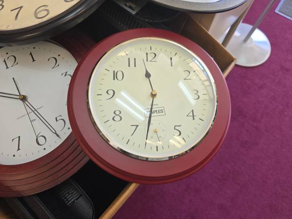 We have some wall clocks available for $15 each. These clocks range from 10" to 16" wide. They are all in working condition. They vary a bit in design, some made of plastic and some with wood. You can easily set these up against wall with a hook or nail. These mostly use AAA or AA batteries. You can see these here at Recycled Furniture in Irving. We have some other office items but mostly office and school furniture to look at. Feel free to contact us for more info. You can also just click on the "more ads by this user" link for more of our inventory.