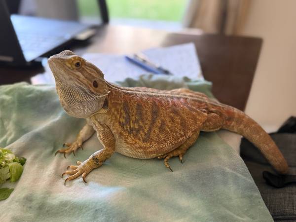 Citrus Tiger bearded dragon. Healthy and seeking a new home and a caring new owner. About 12” long.