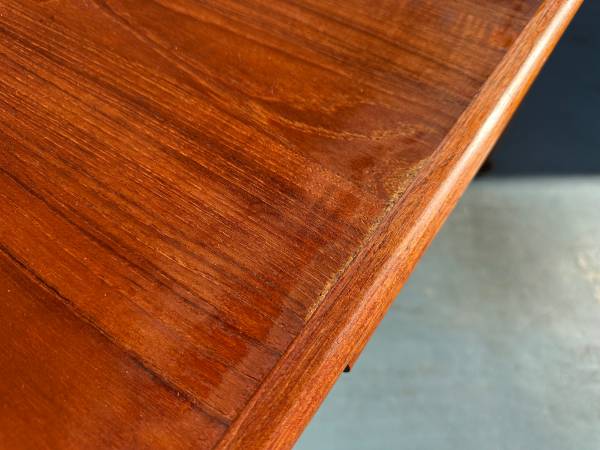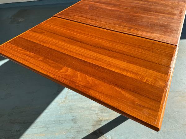 This amazing Beautiful Mid Century Danish Modern Border Furbo expandable Dining Table is in great condition as you can see in the pictures with a few minor wear sports on the middle top surface and edges also a few scratches on the top surface including both leaves, there bottom table has a small veneer repair please see pictures but nothing that will affect the quality.