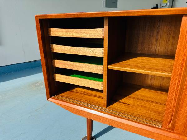 This piece is very well-built high quality with teak wood oil finishing it has 4 small dovetail Silverwear drawers inside with two sliding door on the front shelf inside the frame is teak wood construction with pull wooden handles and screws on legs.
