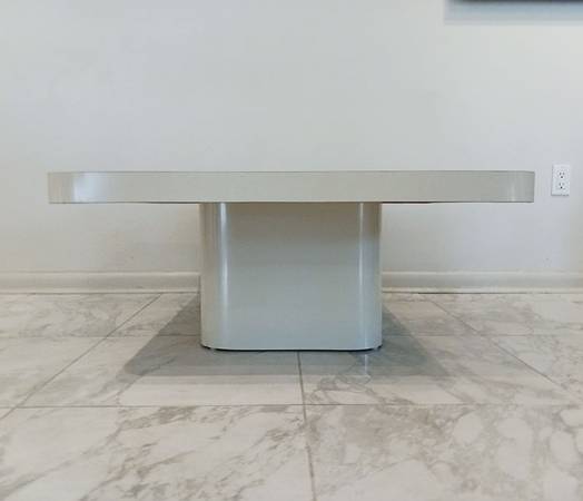 Exquisite mid-century modern coffee table, circa 1970s, that boasts a sleek glossy ivory laminate top and sculptural pedestal base. Perfect for retro or contemporary spaces. In excellent condition with very few blemishes. Dimensions: 36”W x 36”D x 15.5”H.