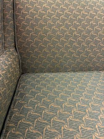 Iconic mid-century modern three-seater sofa featuring a sophisticated forest green geometric pattern (rich and refined — not bright or tacky) on ORIGINAL nylon frieze upholstery (popular in the 1950’s & 1960’s) paired with classic tapered wooden legs. Timeless lines, statement fabric, and that chef’s kiss circular accent pillow included as a bonus.