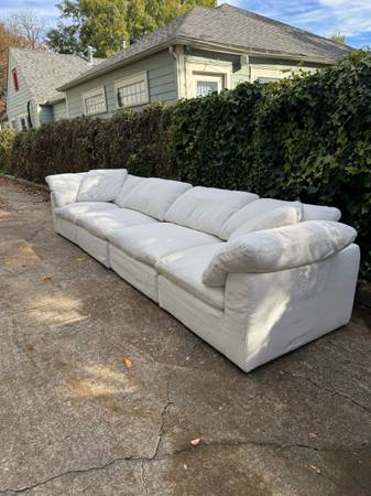 A coveted favorite from Restoration Hardware, this RH Cloud Modular Sofa offers both luxury and lounge-worthy comfort. This 4-piece configuration includes 2 corner chairs and 2 armless chairs in the Classic 40” depth, all upholstered in Perennials® Performance Textured Linen Weave in the color Natural, a high-performance fabric known for its durability, stain resistance, and soft texture.