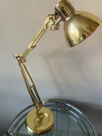 Add a touch of vintage charm to your space with this versatile gold/brass task lamp! Perfectly on-trend, this lamp features a small cubby that works as an ashtray, candle holder, paper tray, or chotchky dish—functional and stylish.