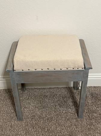 Sturdy wooden bench with comfortable cushion and storage. This is a newly refinished piece using all new fabric and foam rubber.