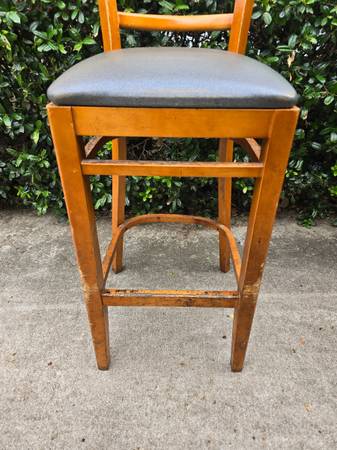 We have a handful of these bar stools available for $45 each. These are made of pretty solid wood with the seats upholstered in gray vinyl. The legs have a bar to put your feet on while you're sitting. The chairs do have some scuff throughout but overall, they are still really solid and usable. They just need a bit of work. You can see these chairs here at Recycled Furniture in Irving. We have several other types chairs to look at. We have office, school, and guest style chairs. Feel free to contact us for more info. You can also just click on the "more ads by this user" link for more of our inventory.