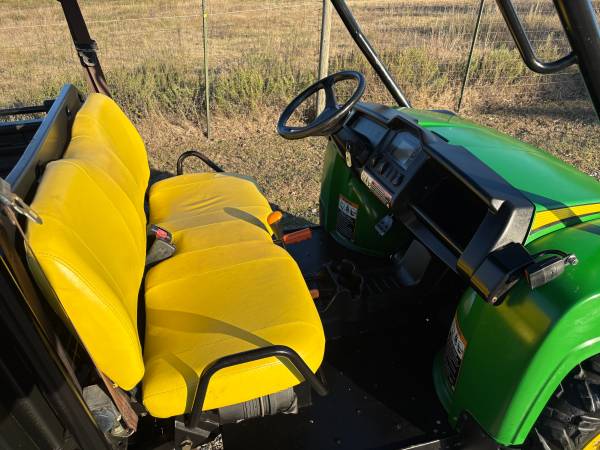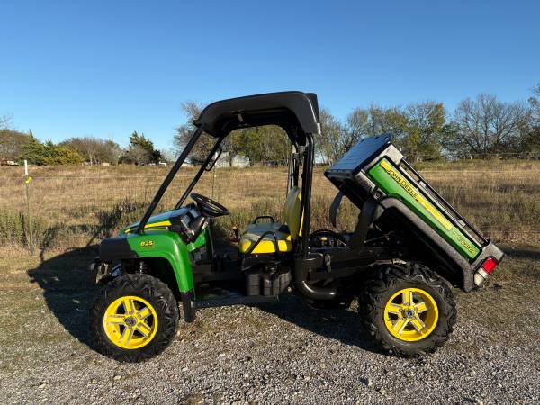 JOHN DEERE GATOR 825i, 3 CYLINDER, FUEL INJECTED, WATER COOLED, GAS, POWER STEERING, 4 WHEEL DRIVE, 4 POST ROPS, QT CANOPY, CARGO BOX UNDER HOOD, FRONT AND REAR RECEIVER HITCHES, FRONT BUMPER, DUMPBED, FACTORY JOHN DEERE MAG WHEELS.