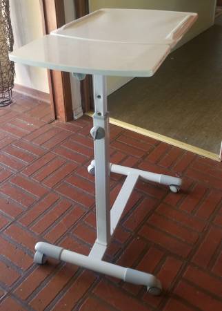 Rolling side table adjusts for height and for slant of top surface