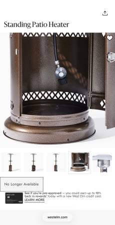 I have a standing patio heater originally purchased new from West Elm. Heater is unopened and still new in box. We are re-doing our outdoor area and are going a different route.