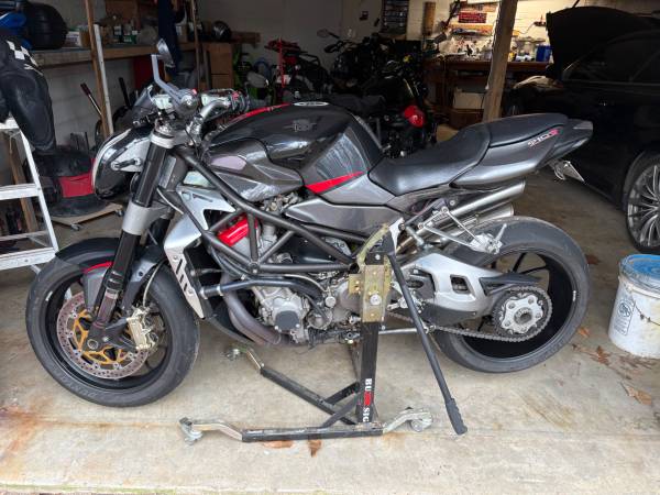 I have had Hayabusas, CBR 1000RRs and 600s and an Aprilia RSV V4. All technically faster but none as visceral and thrilling on a back road as this MV. It is handmade Italian industrial art with purpose. Unfortunately at my age I am sadly no longer able to ride it to its potential. It needs someone who can. Fully serviced by MV Dealer Monkey Moto at 14,900 miles and I imported a clutch from Italy and had Motiv Cycleworks in Tulsa install it while servicing my Guzzi. Other than chip in tank I can find nothing wrong with it but I bought it with a Rebuilt title now in my name. I am including the Bursig lift shown in pictures and specialty socket to remove rear wheel and a Corbin seat