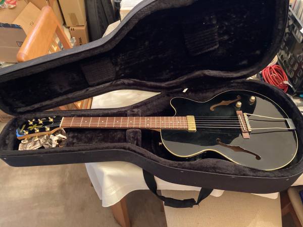 I took this in trade and I have way too many guitars to keep it. 2 pickups. One piezo and 1 electric. Blended with a knob that can go all acoustic or all electric or anywhere in between. When I plugged it in it had a sweet acoustic tone to it. Great for Jazz or Blues. Has a finish crack down by the treble bottom F hole that Erik at Sky Guitars looked at and said it doesn’t go into the wood. And you can’t hardly see it with the guitar being black. This whole instrument reminds me of a Silvertone 1446 in a lot of ways. Fender padded FB1225 gig bag I have on CL in a separate ad is included in this sale unless it sells separately.