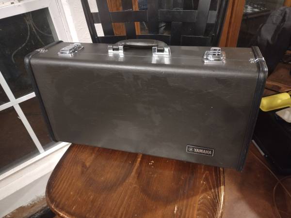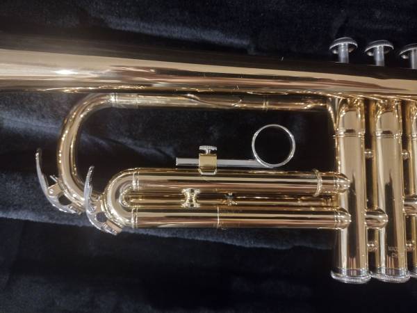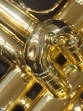 Yamaha's best selling student level trumpet. This fine horn is almost perfect...just two tiny dents in the brass (photos). The gold plating is virtually immaculate...no scratches, corrosion, etc. Valves operate effortlessly. Hard case in excellent shape. Handle and latches all functional. Vincent Bach 5B mouthpiece.