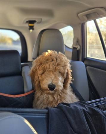 4mnth old goldendoodle pup needing rehoming, last of the litter. House broken,create trained, up to date shots, including rabies. About 35lbs, vocal, active and playful pup. 214txt729for7704more info