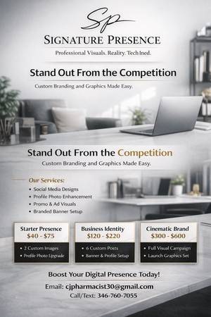 What I can create: • Profile photo upgrades • Social media posts • Business announcements • Promo graphics • Branding style look • Launch visuals