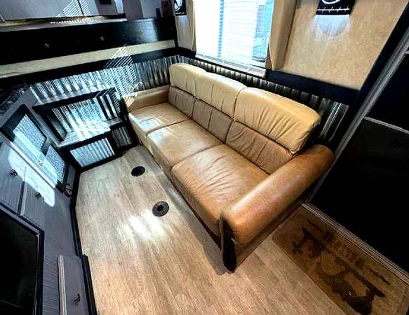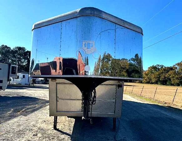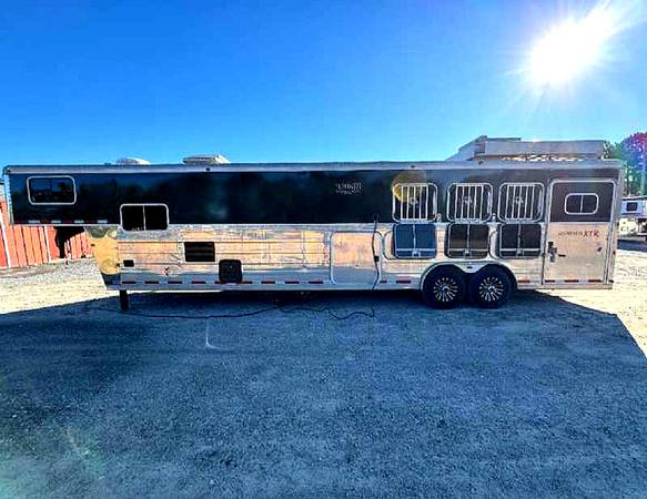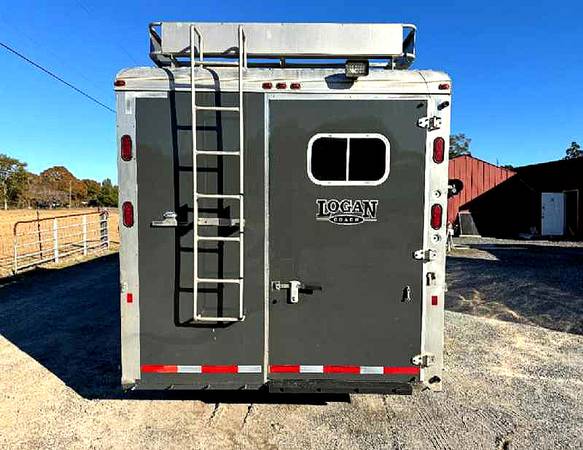 2007 Logan Coach 8314GLQ 3 horse trailer with 14' short wall, 18' long wall, and full living quarters. Features include walk-thru door, sofa, kitchen with cooktop, microwave, fridge, A/C, furnace, bathroom with shower and sink, and onboard generator. All-aluminum build with mangers, hayrack, hydraulic jack, 8000# axles, and awning. Box length 26', 8' wide, 7'4 tall, weighs 5,600 lbs, GVWR 15,000 lbs.