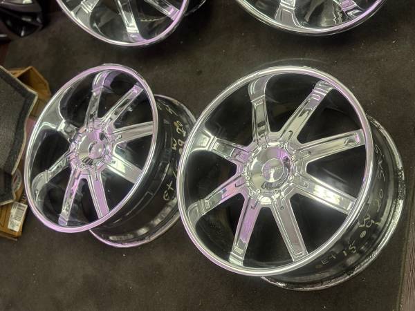 SOME MODELS OF OLDER CHEVY GMC TRUCK OR SUV SOME MODEL OF JEEP DODGE CHRYSLER SOME MODELS OF TOYOTA NISSAN HONDA FORD TESLA MAZDA MITSUBISHI SOME MODELS OF OLD SCHOOL CARS USED RIMS WHEELS 20 INCH CHROME 5 LUG BOLT PATTERN 5 INCH 127 MM 115 MM 114.30 MM 4.50 INCH SET OF 4 NO TIRES LITTLE BIT CHROME SKIN PROBLEM FOR $600.00 A SET NO TIRES, I SALE NEW TIRES.