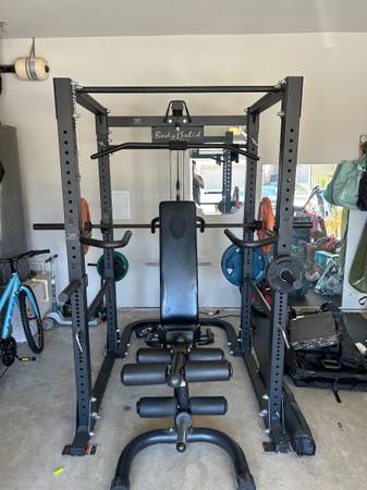 Selling complete weight set including squat rack, bench, rubber plates, 10-50 lb rubber dumb bells, cable machine, dumbbell rack, and several attachments. Text if interested