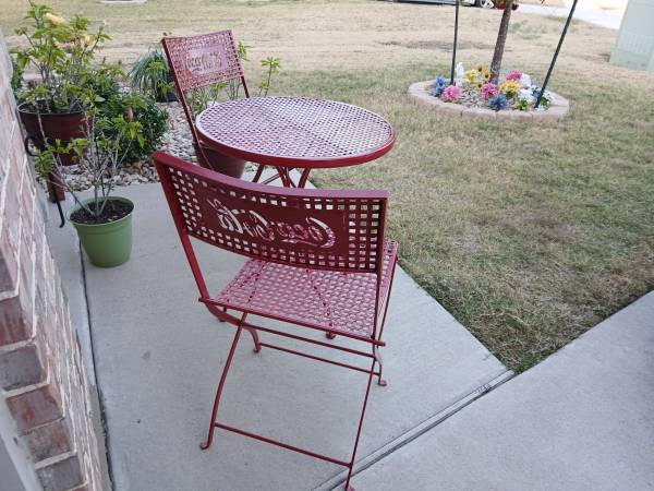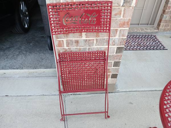 Freshly painted Coca Cola chairs and table. Good condition 3 piece folding chairs and table. $125 If ad is here then still available.