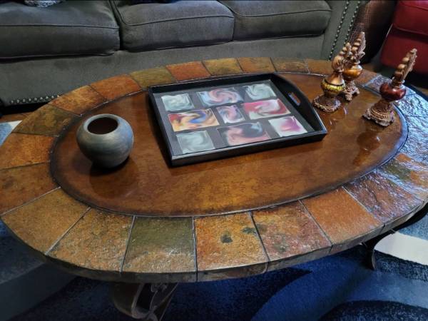 Heavy duty coffee and matching end table, both with inlaid tile on top and sides to match the entertainment center