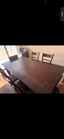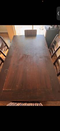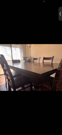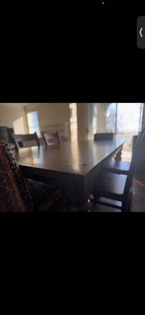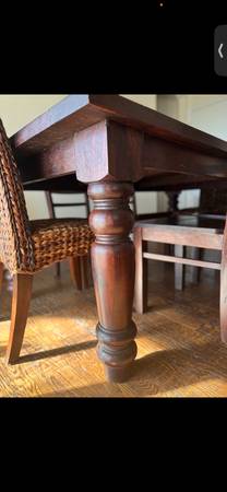 Beautiful solid wood (not veneer) dining table with a rich dark finish and classic turned legs. Very sturdy and heavy — built to last! Seats up to 8 people comfortably (6 matching wooden chairs + 2 woven end chairs included).