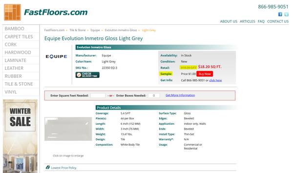 Equipe Evolution Inmetro Gloss Light Grey Subway Tile Looks white. You be the Judge. Pictures taken at dusk. Retail $18.20 SQ FT. / Out The Door $19.70 50% OFF $9.85 SQ FT. 16 Boxes. 169 SQ FT....