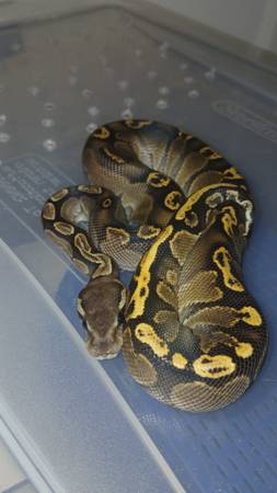 Rehoming this male baby snake. This is a GHI Black Pastel. He has been handled regularly and is calm and not defensive. He has a very unique pattern that will be able to be passed to his offspring if he is ever bred. He eats well and will make a great pet. The rehoming fee is 165. Text to arrange local pickup.