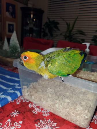 Baby Sun Conure, Very tame, Bright and colorful!😊😍 looking for new home. Pending DNA Test. Hatch date 11-12-25. As of 12-21-25 He/She is 5 weeks and 4 days old. He/She is very Tame, hand feed and contact daily. Please message me. More pictures available on request. Can arrange viewing in person if you wish. He/She is getting very vocal and exercising her wings. Feel free to contact me anytime for any additional questions or would like to see more pictures.