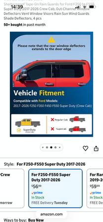 I have a set of tape-on rain guards for a Ford F250 SuperDuty that I had purchased, but I never got around to installing them, and now I've decided I don't want them anymore, and I am beyond the time frame to return them. These will fit any F250-F550 2017-2026.