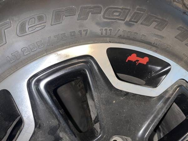 LT 255 / 75 R17 Baja Champion Mud Terrain Tires with Jeep Machined Black OEM 17 inch rims. This set of tires and rims are brand new. The tires have never been driven on. Prices for new rims range from $265 - $350 each. New Mud Terrain tires cost around $325. This prices is based on $195 a piece for the 5 rims and $225 each for the tires.