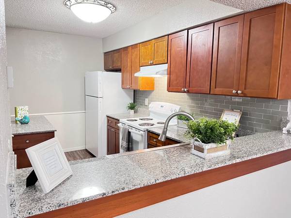 Today we have a 2-bedroom, 2 bathrooms with #1115 This spacious apartment features solid cabinets throughout, granite countertops, European bowl sink in the bathroom, and wood vinyl flooring with full size washer and dryer connections!!