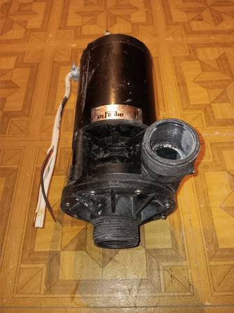 This is an Aqua Flo 3/4 HP Pool Pump. The model is unknown. The pump connections are about 1.5" ID with both male and female threads. It's about 6" wide and 14" long.