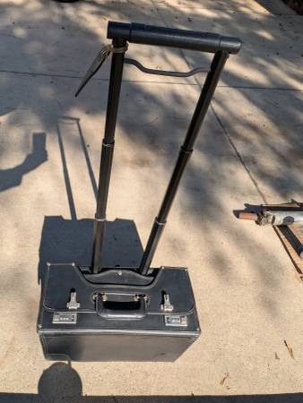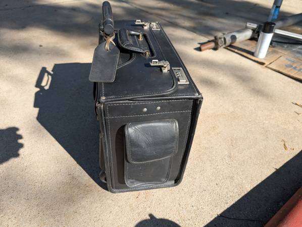 Up for sale is a Classic Locking Wheeled Pilot Crew Travel Flight Case Tool Bag Luggage. Nice leather. . All zippers work. Very sturdy and well made. Long Handle