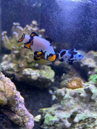 Beautiful & unique clownfish pair. Very healthy and love to eat. The smaller black & white one is a Black Storm clown and was $160 at the Dallas North Aquarium. I think the bigger white & orange one is a frostbite clown and was $70.