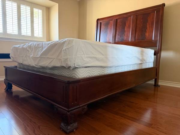 Beautiful Solid Mahogany Bed Frame. Custom built in North Carolina by Craftique which manufactured top-end furniture from mahogany wood (seller is original owner) . Bed frame is queen and in excellent condition. The mattress has been encased in a sanitary cover and in a guest room infrequently used. Frame Length: 88". Width: 65". Distance to top of mattress: 27". Distance to top of headboard: 63". $200 for everything. Cash Only.