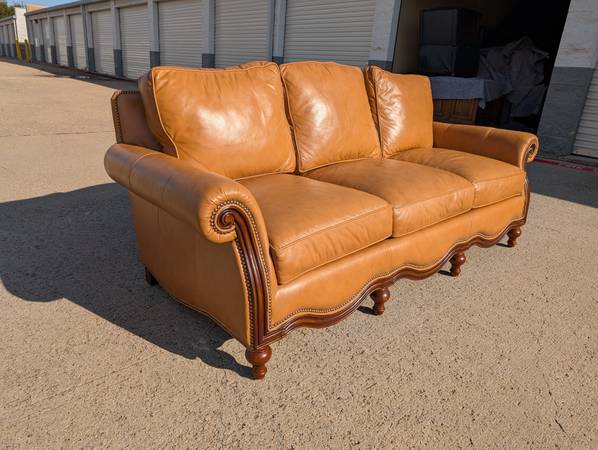 Full grain leather sofa made by Brandington Young. It's in near brand new condition and is very comfortable. A very high end and elegant sofa with intricate wood work. This sofa is made to last a lifetime. Nailheads run all the way around the sofa.