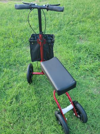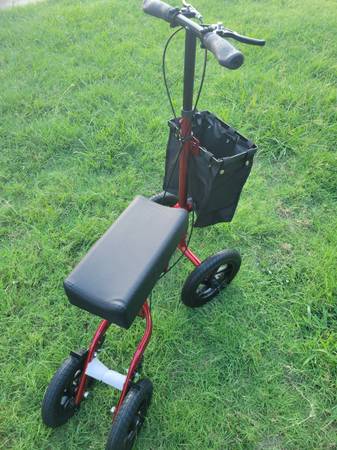 Selling brand new condition Knee scooter all terrain Ideal for individuals recovering from foot surgery, breaks, sprains, ulcers of the foot, deluxe lever hand brake ensures safety; 350 pound weight capacity, height adjustment; "12"front size tires "10" rear size tires caster are ideal for indoor and outdoor used. If you are interested please I'm asking $120. Cash only! Must pick up thank you.