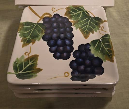 This set comprises four ceramic appetizer plates, each with dimensions of 8.5 inches square. The plates are adorned with an elegant grapevine pattern and remain in pristine, unused condition within their original packaging from a smoke-free environment. Designed for convenience, they are both dishwasher and microwave safe, making them well-suited for hosting small events.