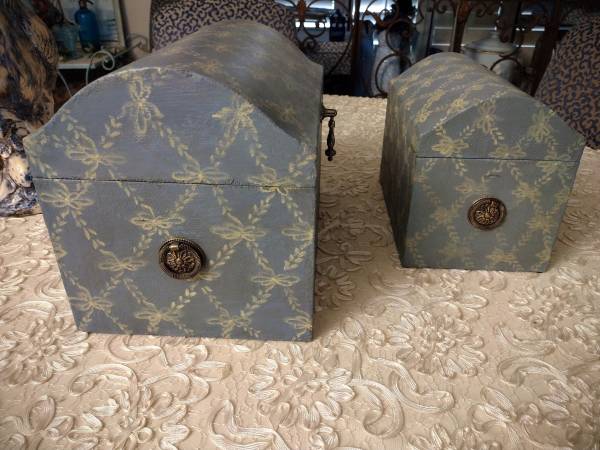 Pale blue with light green design, magnetic closures, and pretty hardware. Measures 12" by 8.5" and 9.75" x 6.25"