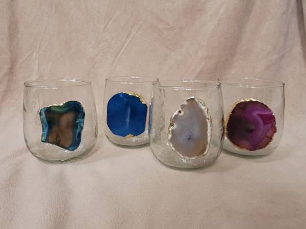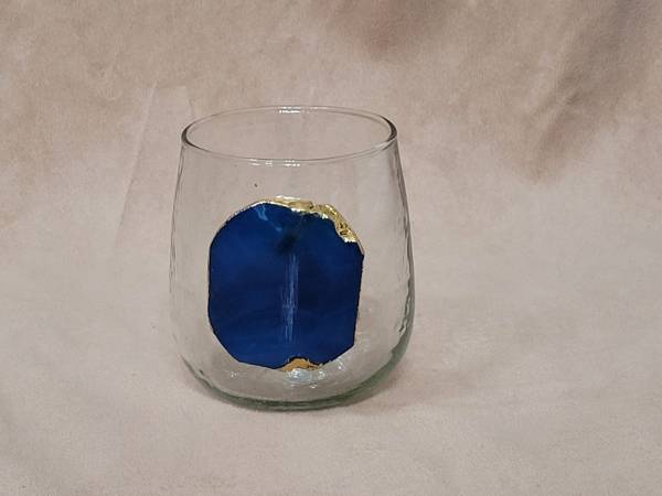Each of these hand-blown, stemless wine glasses is adorned with a piece of geode or agate rimmed with gold foil. Item notes say they were handmade in India. Priced for the set, but will separate...
